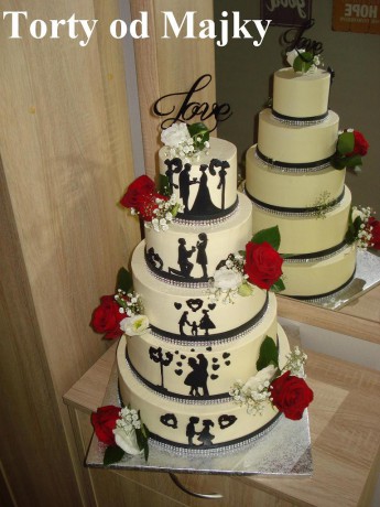 spodok: čoko korpus, smotanová plnka 2.p.: vanilkový korpus, karamelová plnka 3.p.: čoko korpus, pribináčková plnka 4.p.: vanikový korpus, pistáciová plnka 5.p.: mramorový korpus, čučoriedková plnka obtretá plnkou s bielou čokoládou váha: 14 kg